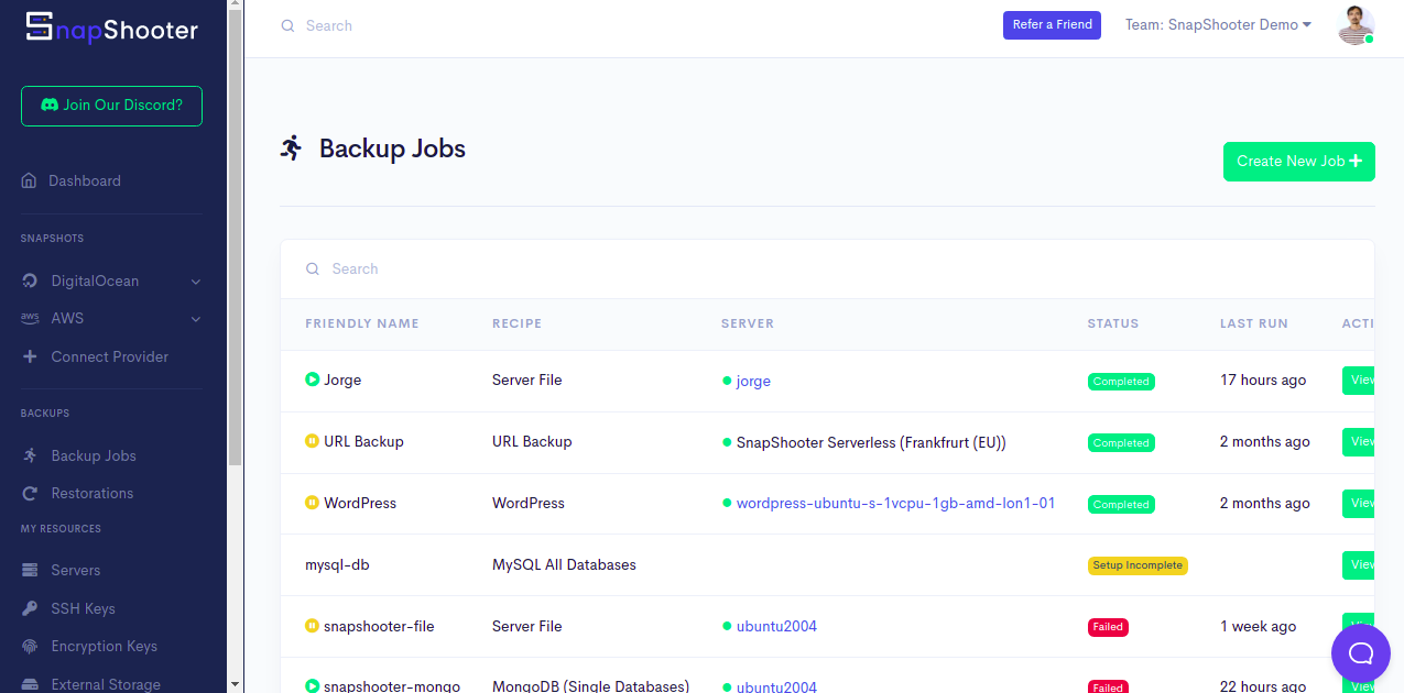 Step 1 - On the SnapShooter dashboard, click on the Backup Jobs in the left sidebar. You should see the following screen:
