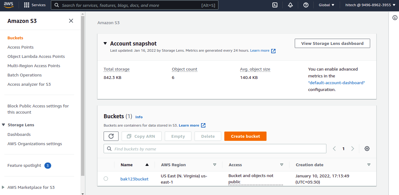 Step 3 - Type your bucket name, select your region, Select object ownership, Block all public access, and click on the Create bucket. Once the bucket is created, you will get the following screen: