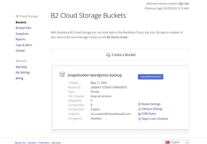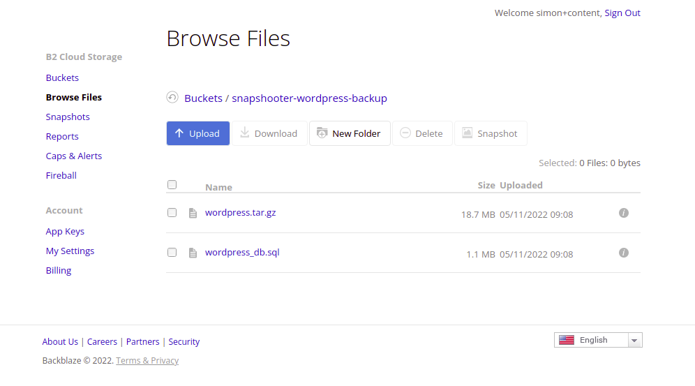 You can also verify your backup files by logging in to BackBlaze and click on your bucket name. You should see the following screen: