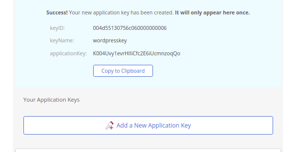 Note down the keyID, and application key from the above image. You will need both to integrate Backblaze with the application.